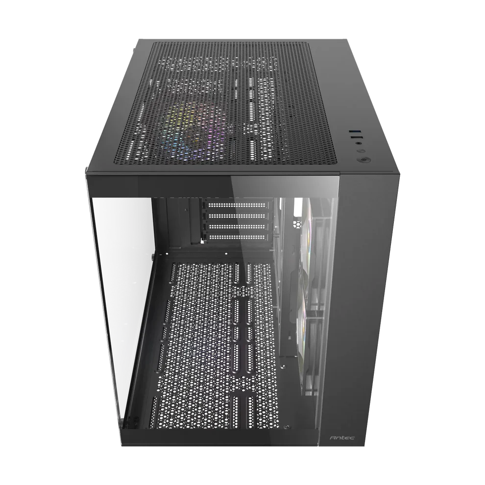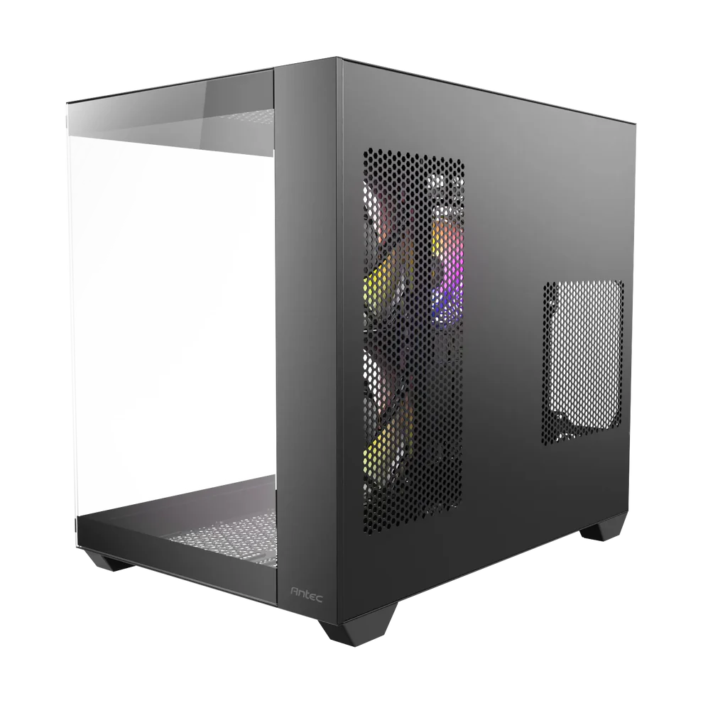 Le boîtier gaming moyen tour Antec CX800 ARGB offre une vue panoramique à 270° grâce à sa vitre latérale et est conçu avec une double chambre pour assurer un refroidissement indépendant du processeur/carte graphique et de l'alimentation/disques durs. Il est disponible en noir, blanc et finition bois.