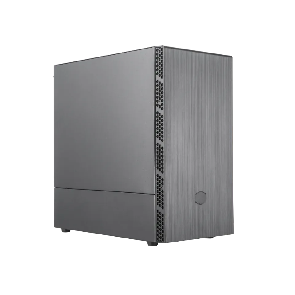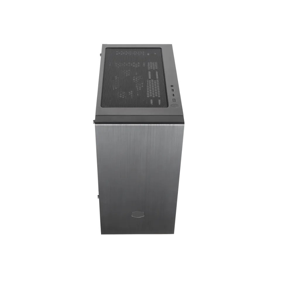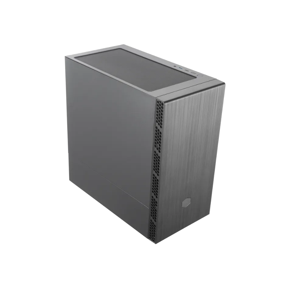 MasterBox MB400L sans ODD — boîtier PC au design élégant avec grand panneau avant brossé, logo hexagonal, et entrées d’air mesh assurant un flux d’air remarquable et de nombreuses options de refroidissement.