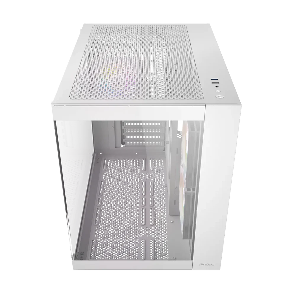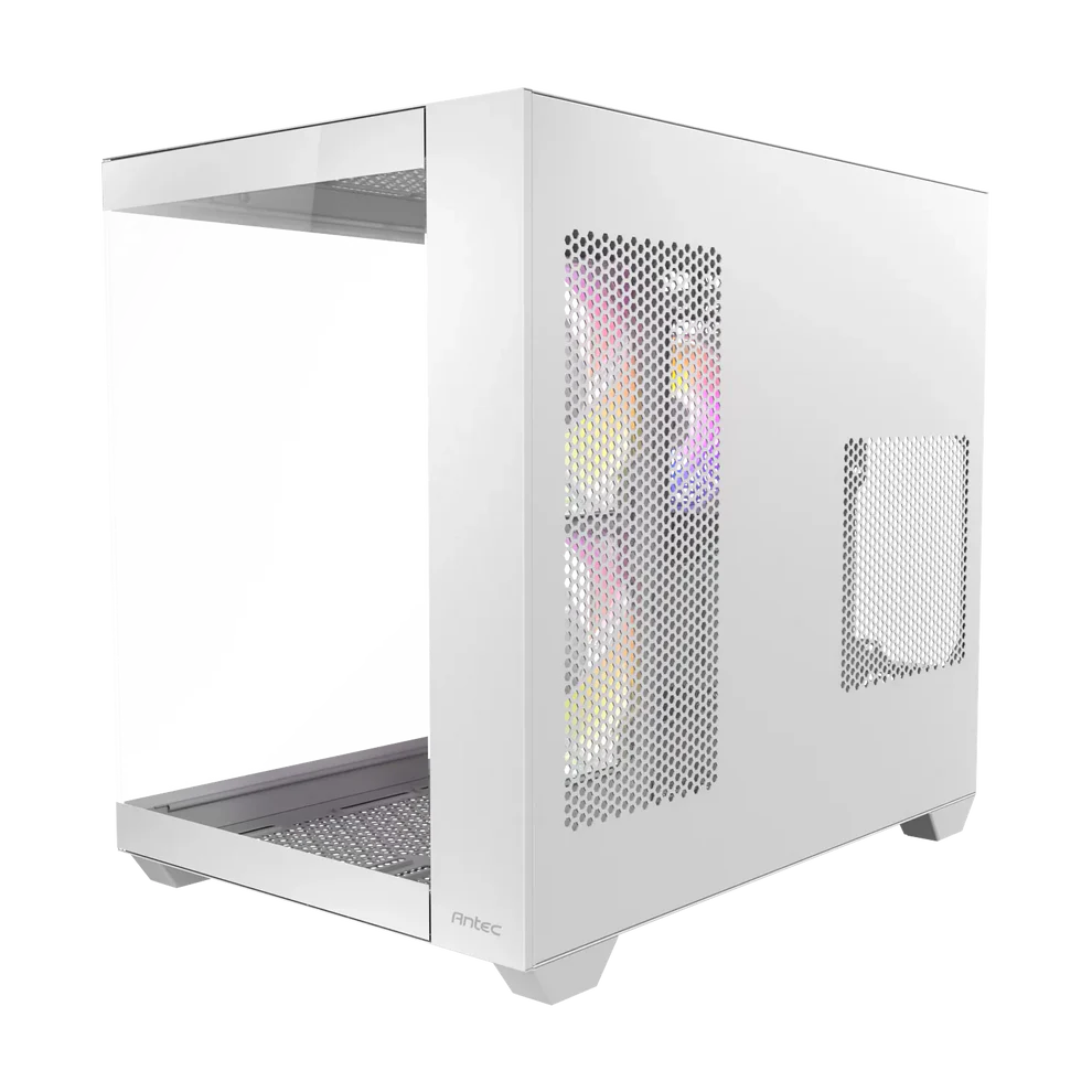 Le boîtier gaming moyen tour Antec CX800 ARGB offre une vue panoramique à 270° grâce à sa vitre latérale et est conçu avec une double chambre pour assurer un refroidissement indépendant du processeur/carte graphique et de l'alimentation/disques durs. Il est disponible en noir, blanc et finition bois.