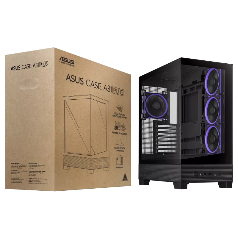Le boîtier ASUS A31 PLUS ATX prend en charge les cartes mères à connecteurs dissimulés, les radiateurs de 360 mm et les cartes graphiques de 380 mm, avec des options de coloris noir ou blanc, quatre ventilateurs ARGB préinstallés et une gestion propre des câbles.